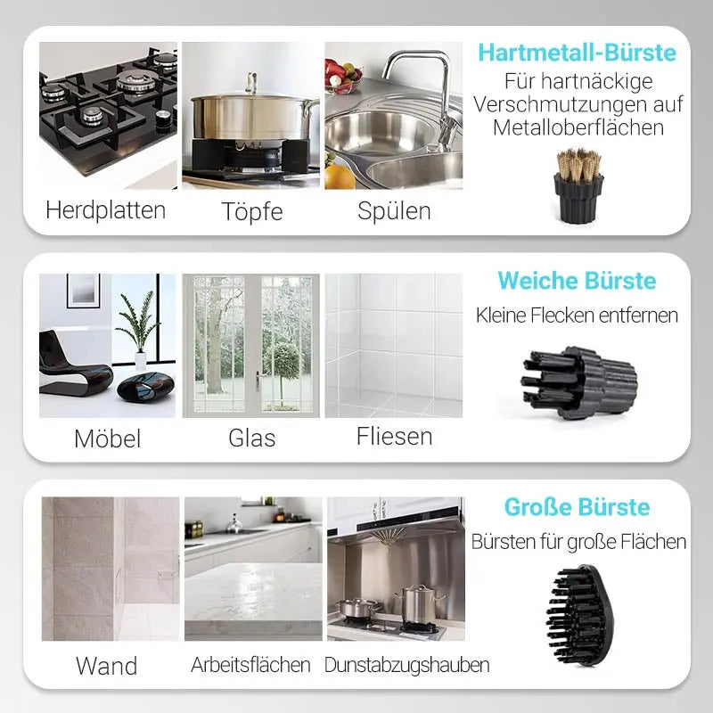 • Hartnäckige Fettablagerungen in der Küche – mühsames Schrubben mit aggressivem Chemie? 🍳 • Giftige Rückstände von Reinigern auf Lebensmittelkontaktflächen (Theken, Herd)? 🥗 • Viel zu viele separate Reiniger für verschiedene Oberflächen – kostspielig & platzraubend? 🧴 • Abrasive Reinigungsschritte beschädigen Holztüren, Keramik oder Metalloberflächen? 🪑 • Lange Aufheizzeiten bei herkömmlichen Dampfgeräten – Zeitverlust? ⏰