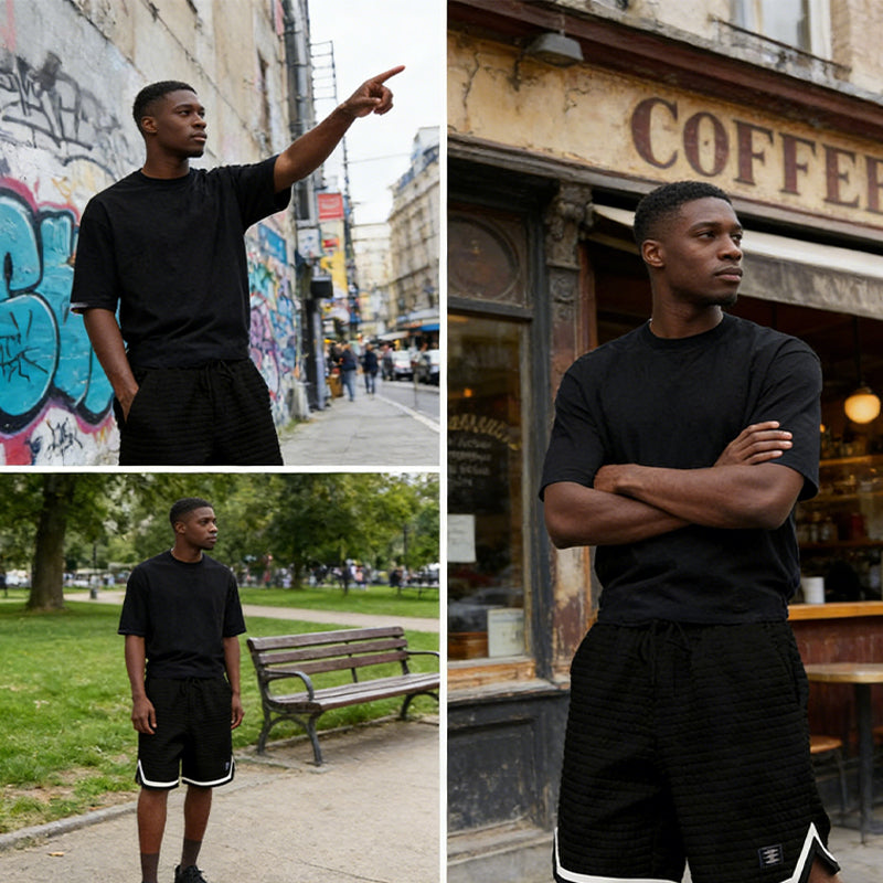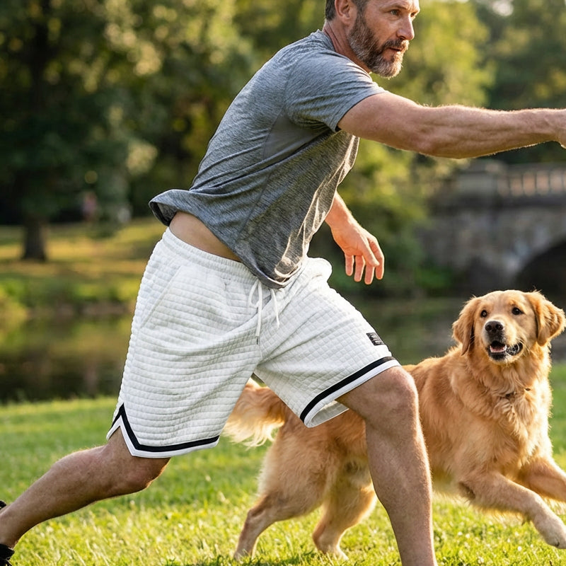 Sportlicher Streifensaum – Der klassische Streifenbesatz und der Seitenschlitz verleihen der Shorts einen sportlichen Retro-Look. Dieses Designdetail verbessert nicht nur den Style, sondern auch die Bewegungsfreiheit bei sportlichen Aktivitäten.