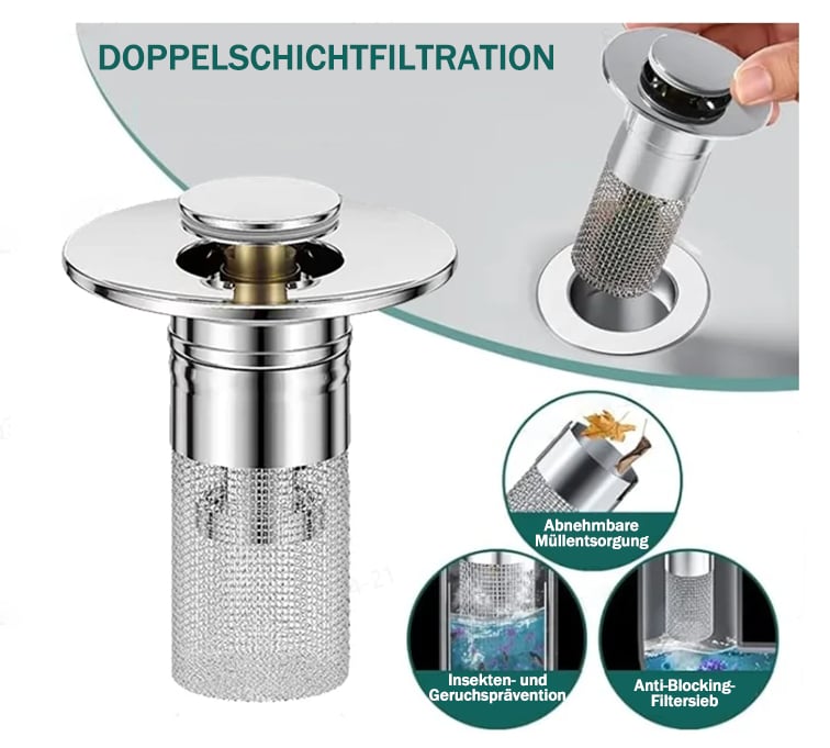 Im Gegensatz zu herkömmlichen Druckknopfabläufen verfügt dieser Ablaufstopper über einen gegen Verschmutzung ausgelegten Korb in der Mitte, der Haarsträhnen sauber sammelt und verhindert, dass der Abfluss zutrifft. Schmuck, Ringe, Dreck und andere Gegenstände gelangen nicht in die Abflussrohre.